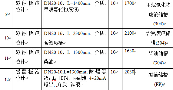 中標(biāo)磁翻板液位計(jì)的部分參數(shù)