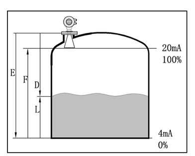 通過輸入空罐高度E(=零點),滿罐高度F(=滿量程)及一些應用參數(shù)來設定,應用參數(shù)將自動使儀表適應測量環(huán)境。對應于4-20mA輸出。